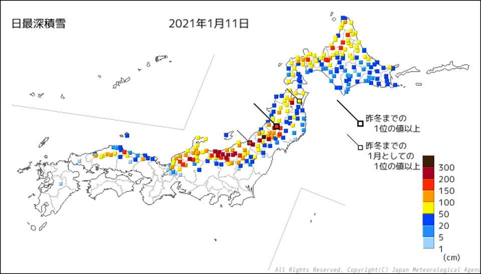 ・最深積雪…上越市高田(新潟)231センチ(35年ぶり)、富山127センチ(36年ぶり)、福井107センチ