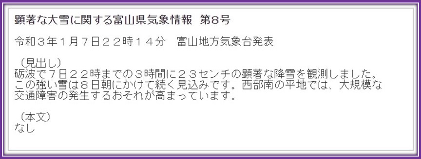 「顕著な大雪に関する情報」が、朝再び富山県内に発表されたほか、福井県内・新潟県内でも相次いで発表。輪島上空5200m付近の気温は-40.8℃を観測(午後9時)。